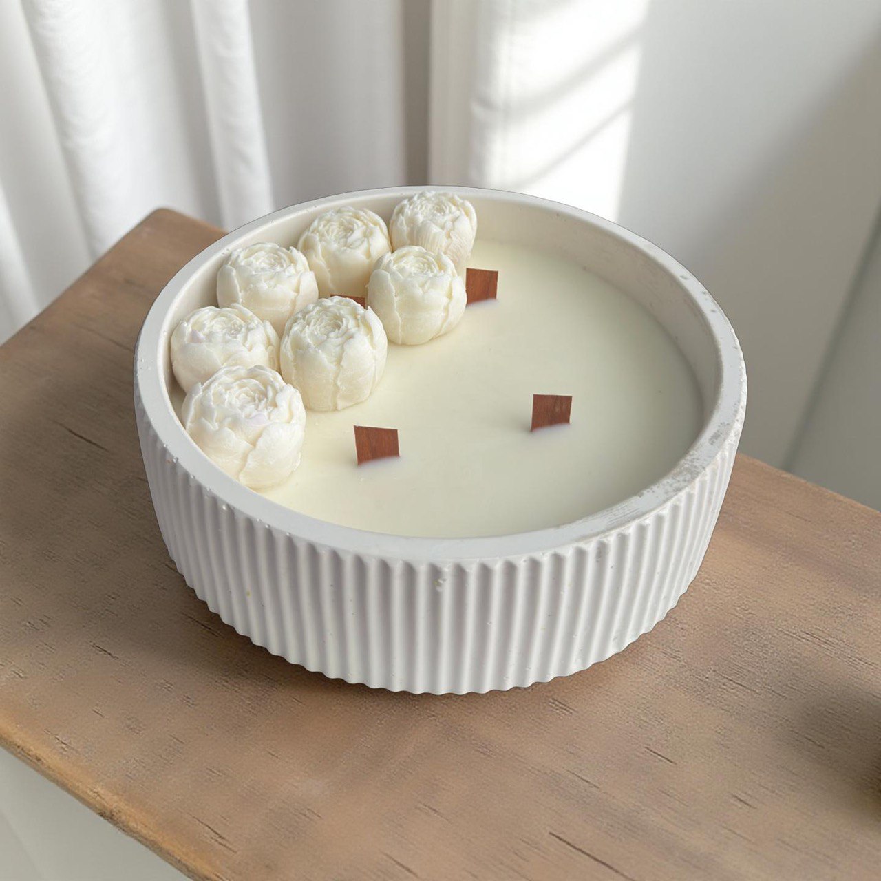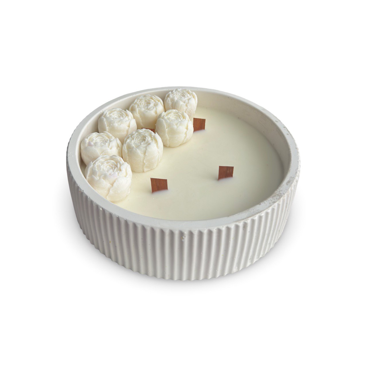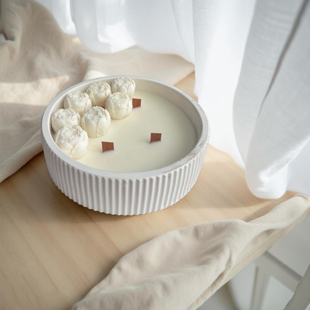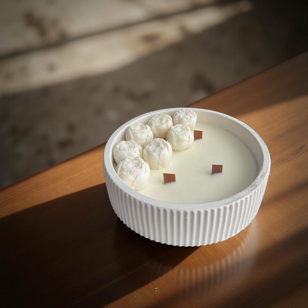 Petali Bianchi este o lumânare florală artizanală cu parfum discret și design sculptural, creată pentru a aduce liniște și lumină spațiului tău. Turnată manual în ceară naturală, cu flori delicate modelate cu grijă, această piesă evocă puritatea unui început nou. Vasul ceramic alb, cu textură striată verticală, completează estetica minimalistă și sofisticată.