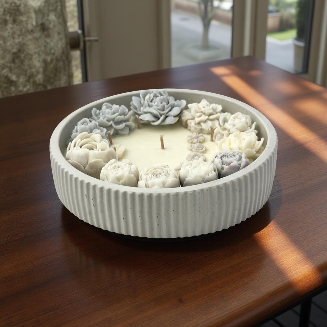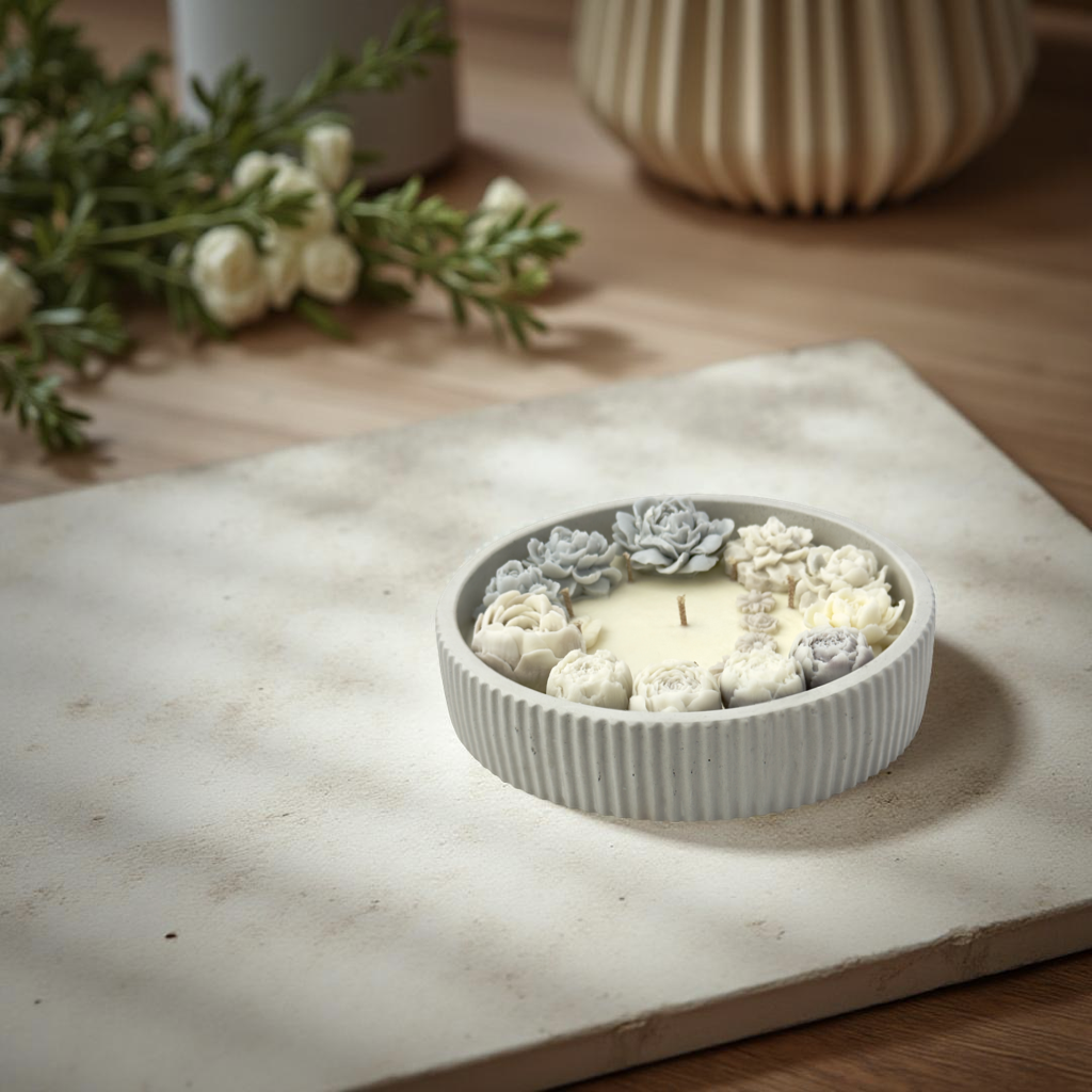 Lumânare decorativă de mari dimensiuni, realizată manual din ceară 100% soia, cu flori sculptate în tonuri de gri, alb și crem. Vas alb texturat, 22 × 5 cm, 1328 g. Ideală pentru decoruri elegante sau cadouri premium.